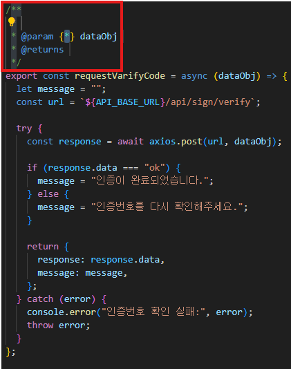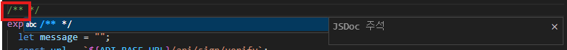 2. /** 를 입력하고 Enter 를 누르면 VS Code가 자동으로 JSDoc 템플릿을 생성해준다.